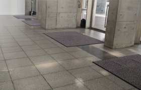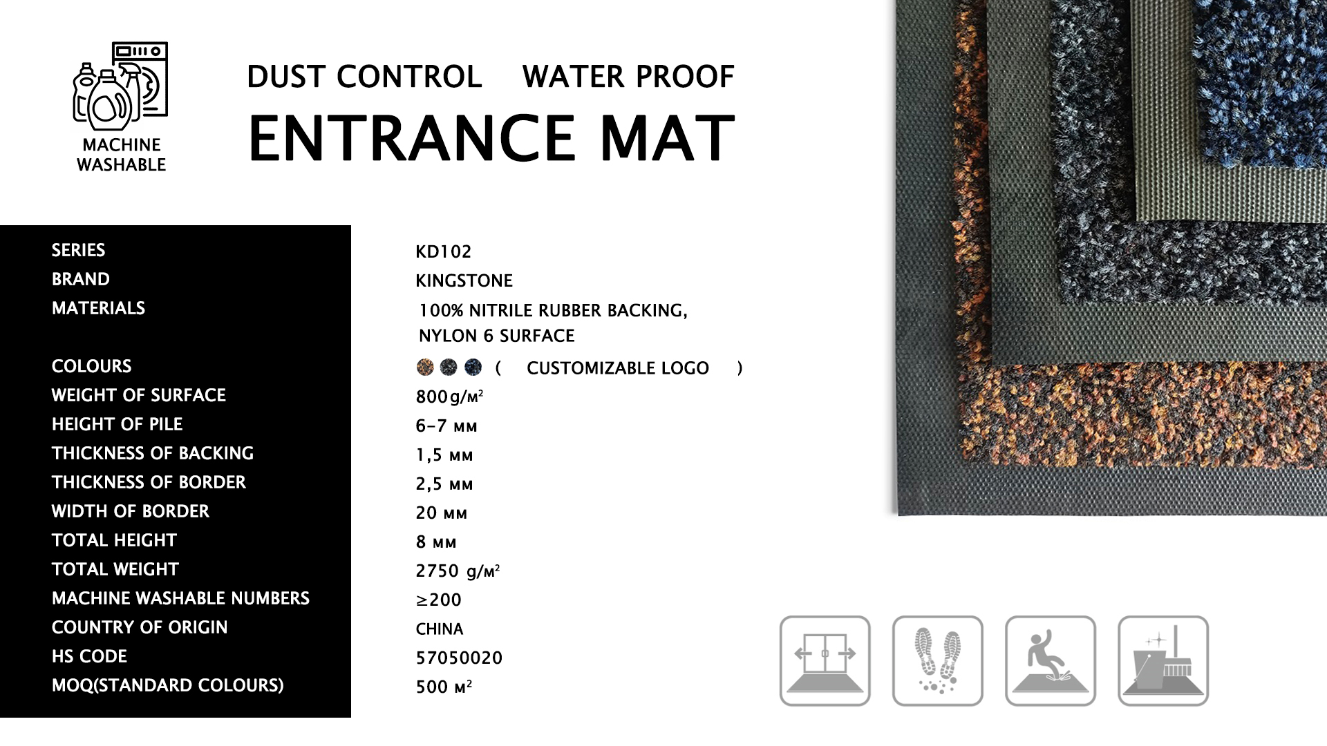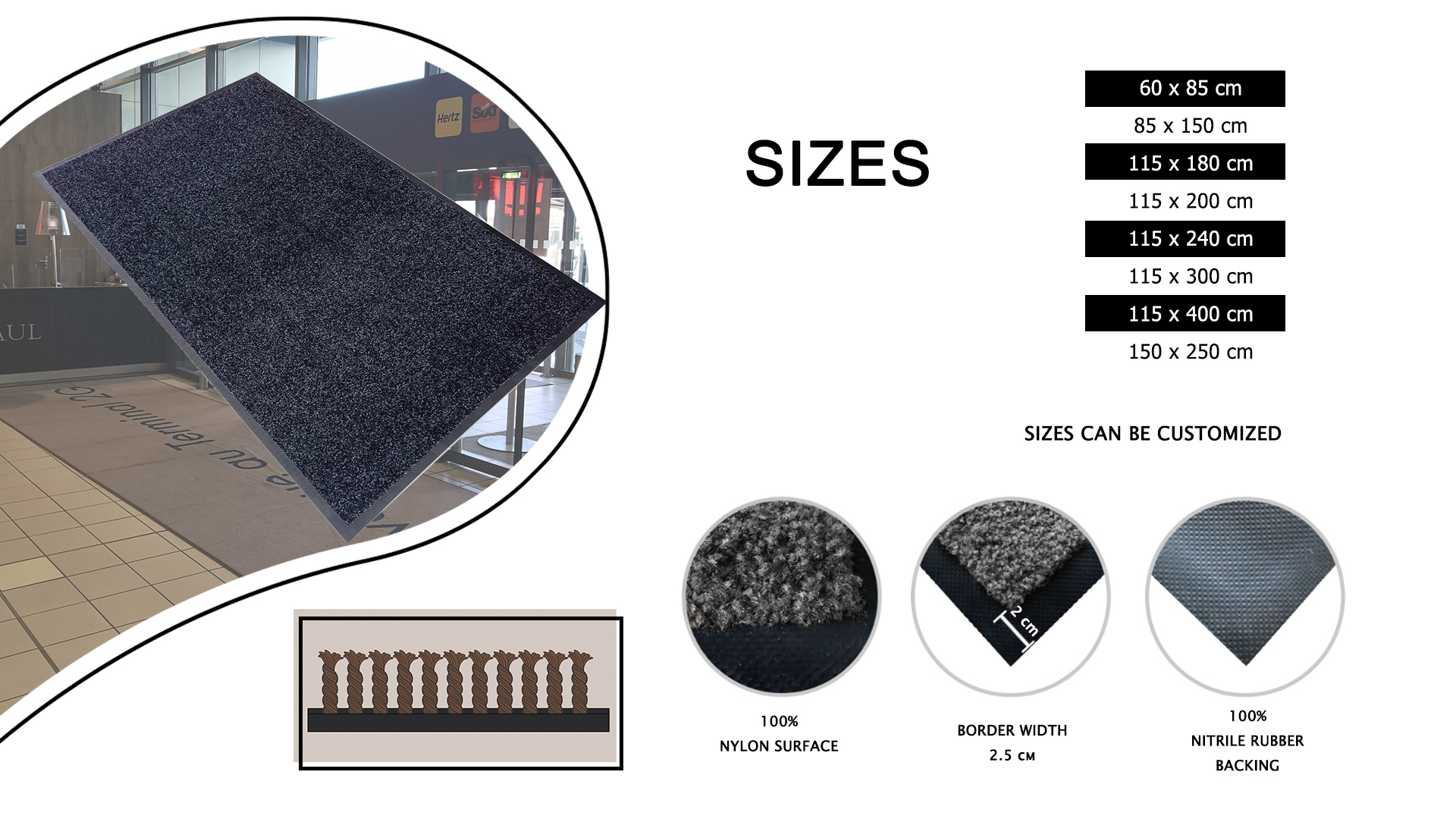 Solution dyeing carpet rubber mats with rubber backing are good for entrance.